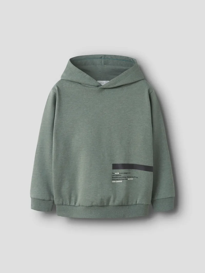 Φούτερ σε χακί απόχρωση της εταιρείας Name it, τύπωμα πίσω, με κουκούλα, κανονική εφαρμογή.