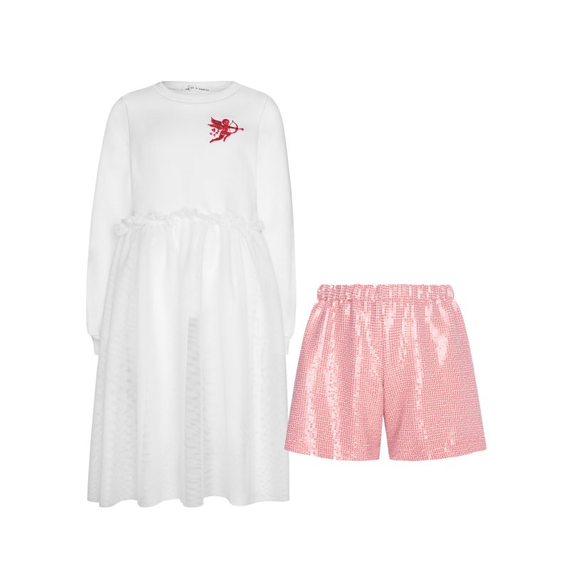 Σετ σε λευκή απόχρωση της εταιρείας Two in a Castle, αποτελείτε απο σορτς σε ροζ απόχρωση με πούλιες και λευκή μπλούζα με φούστα απο τούλι.